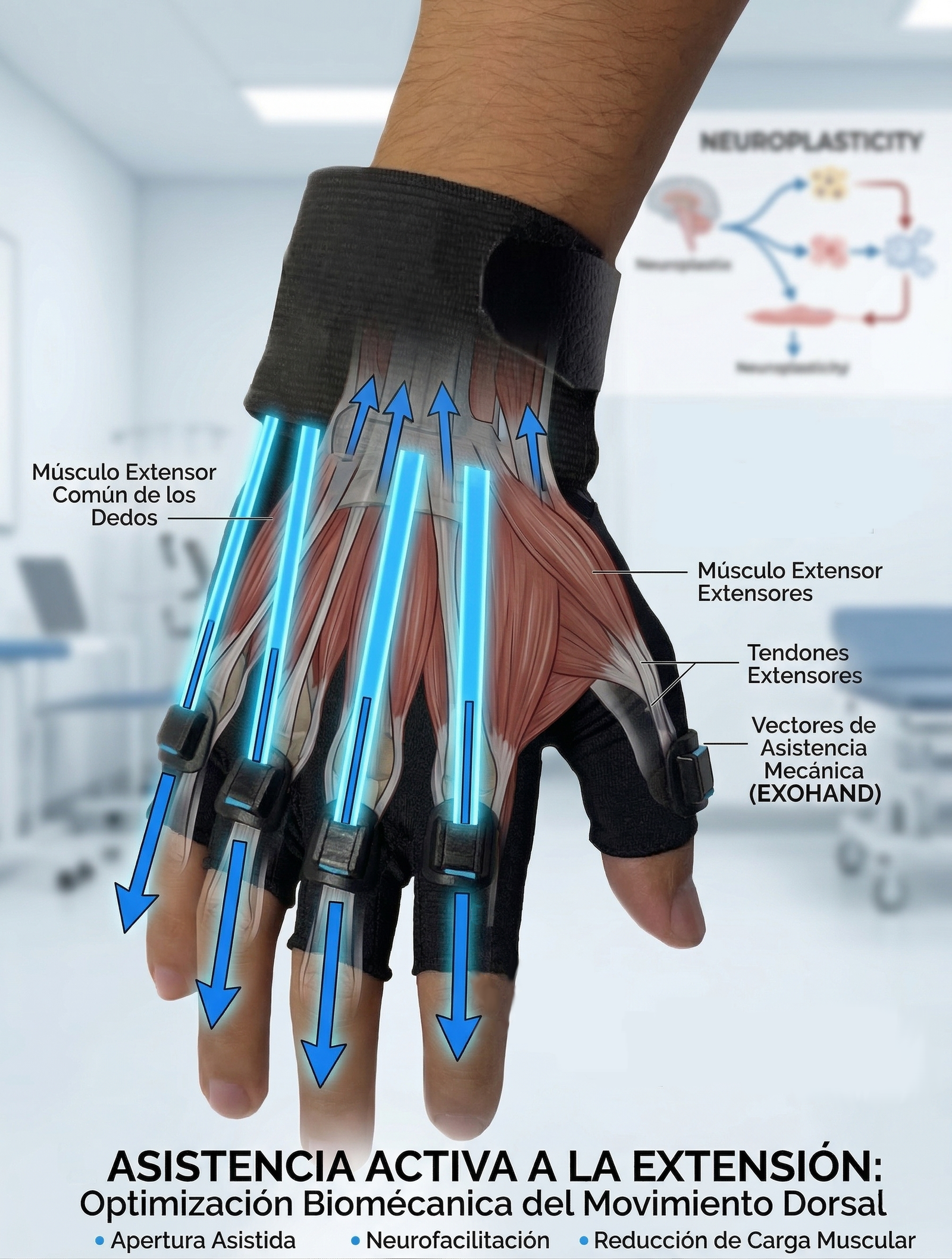 El núcleo de EXOHAND radica en su sistema de tensores elásticos situados en el compartimento dorsal. Estos actúan como un “músculo externo” que asiste la fase de apertura, facilitando la acción de los músculos extensores de los dedos y la muñeca. Esto es crítico en pacientes con sinergias flexoras o debilidad severa, donde la fase de liberación de objetos se encuentra comprometida.